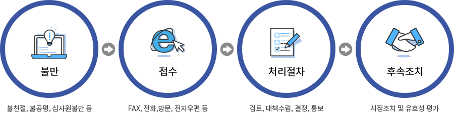 접수된 사항의 검토 - 원인 및 대책수립 - 최종 결정 - 처리 결과 통보